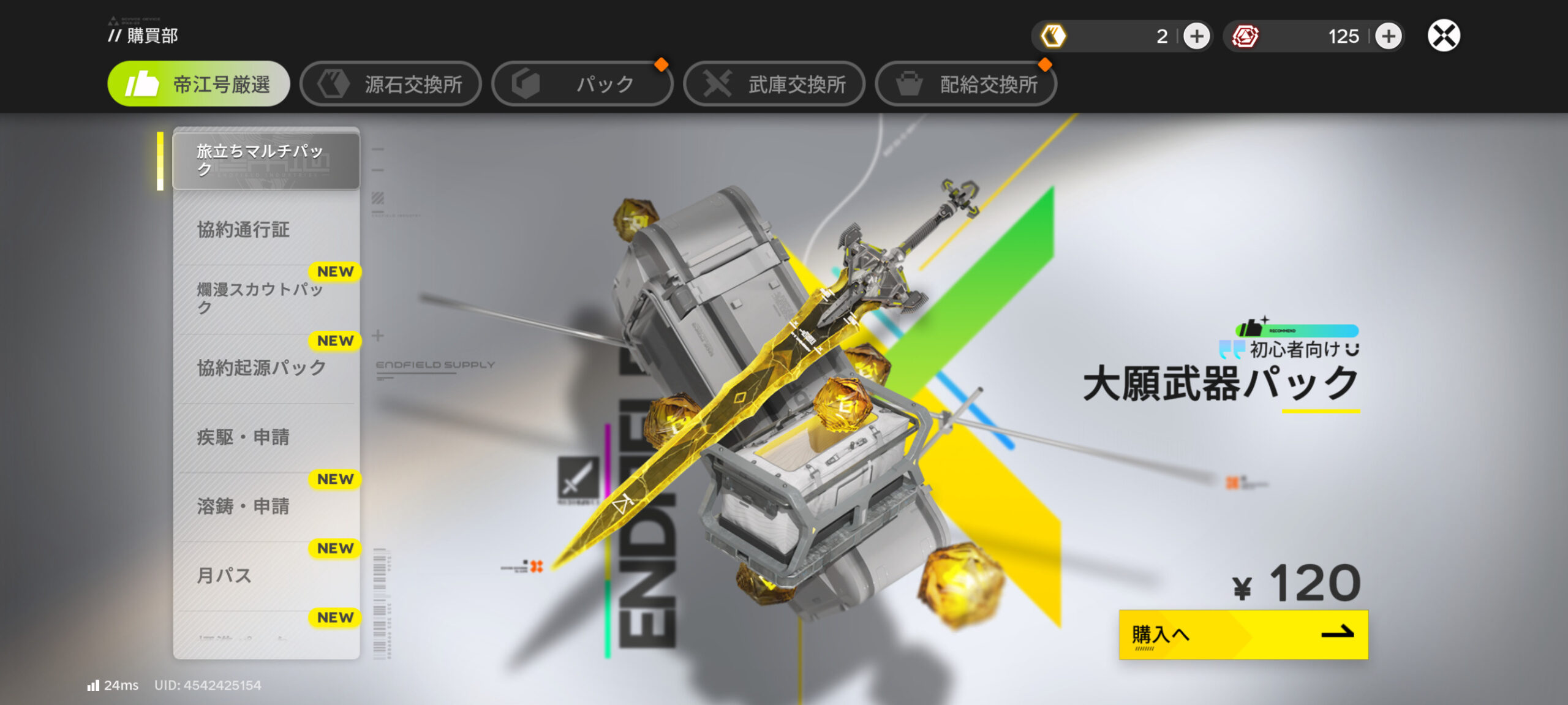 120円というリーズナブルな金額で、強い武器と源石を6個手に入れることができる内容です。