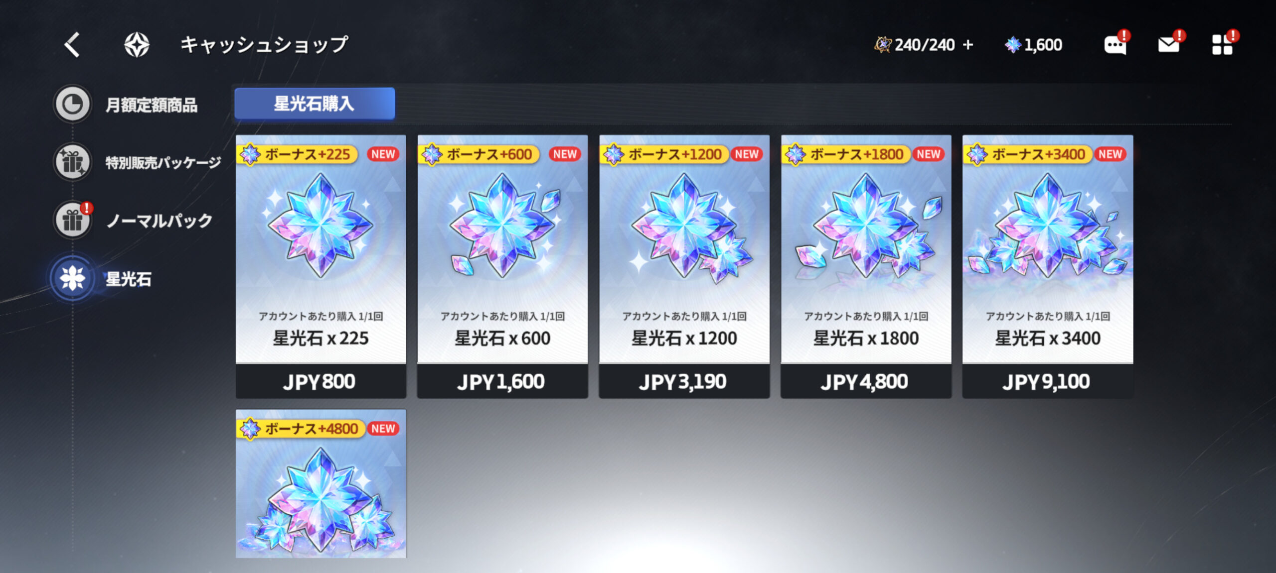 800円で225個から購入をすることができ、最大で12800円、4800個まで買えるラインナップです。